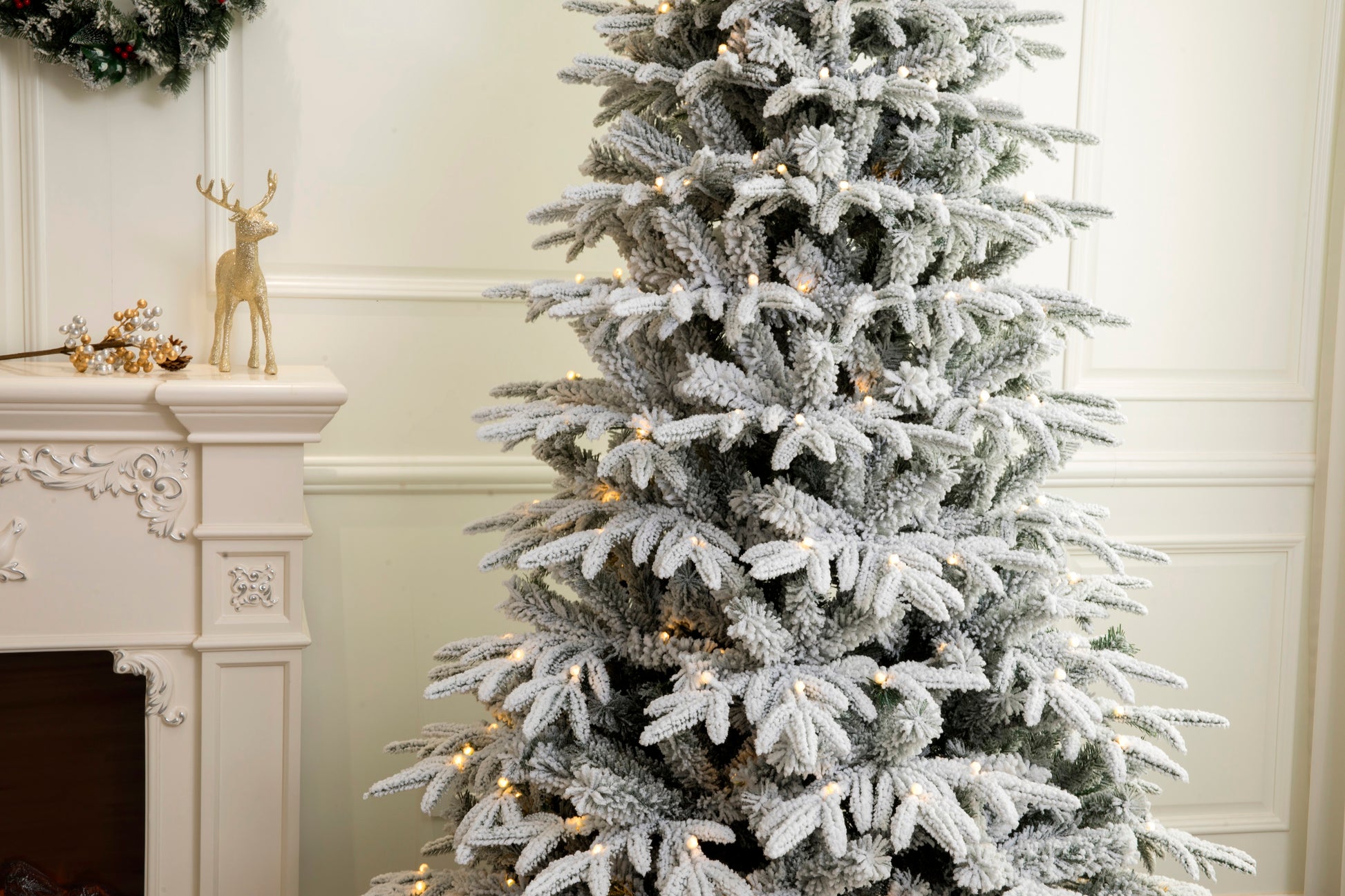 A charming vision of winter. This expertly crafted artificial Christmas tree brings the beauty of nature inside your home. A snowy forest spruce flocked Christmas tree. Perfect layers and the narrow shape, gives you a no-fuss way of decorating tight spaces in a snap, with the Real feel outer PE tips, which are carefully molded, looks real, feels real. Every branch is covered by pure white snow, adding a touch of enchantment to your display. Eco-friendly material, you might not feel it, might not see it, by choosing the Eco-friendly material Christmas tree, you are on the right path to saving the environment. Pre-lit with bright and warm LED clear lights, you can chose from 8 different settings to express the joy and the spirit of Christmas season.